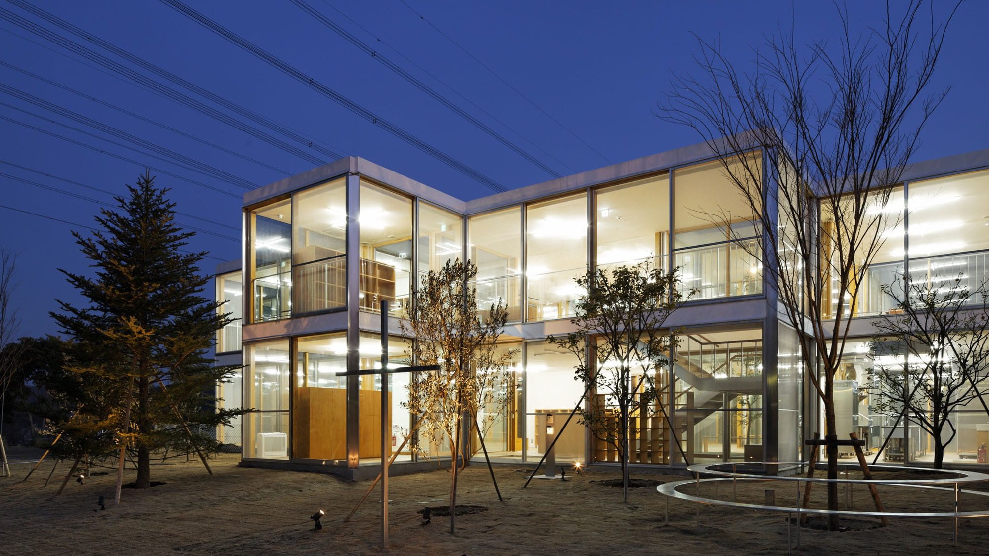 まず、不整形なのは床スラブです。事務室、講義室、共用部といった內部の用途に応じて定義された不規則なボリューム。この內部空間の輪郭と外裝の描く曲線が等しくなるよう、サイズと形狀の異なる床スラブを設け、スラブとカーテンウォールの距離を一定に保つ工夫がされています。