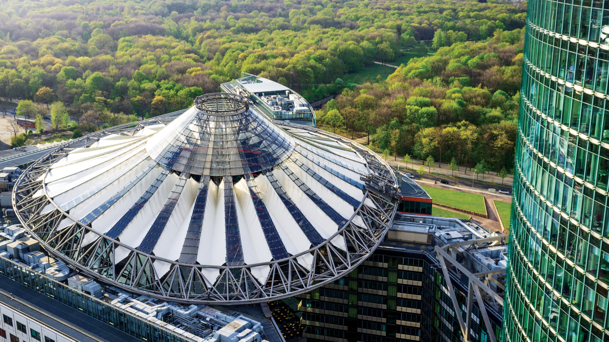 The elliptical plaza of the Sony Center 'forum' is the centrepiece of the Potsdamer Platz redevelopment project. It is crowned by a spectacular and innovative roof.